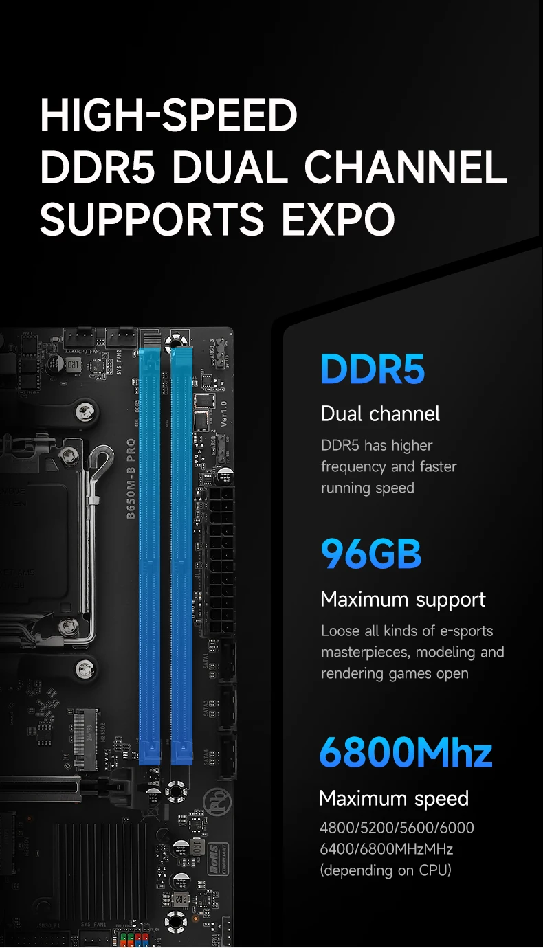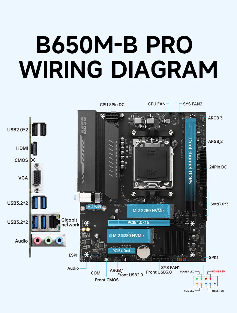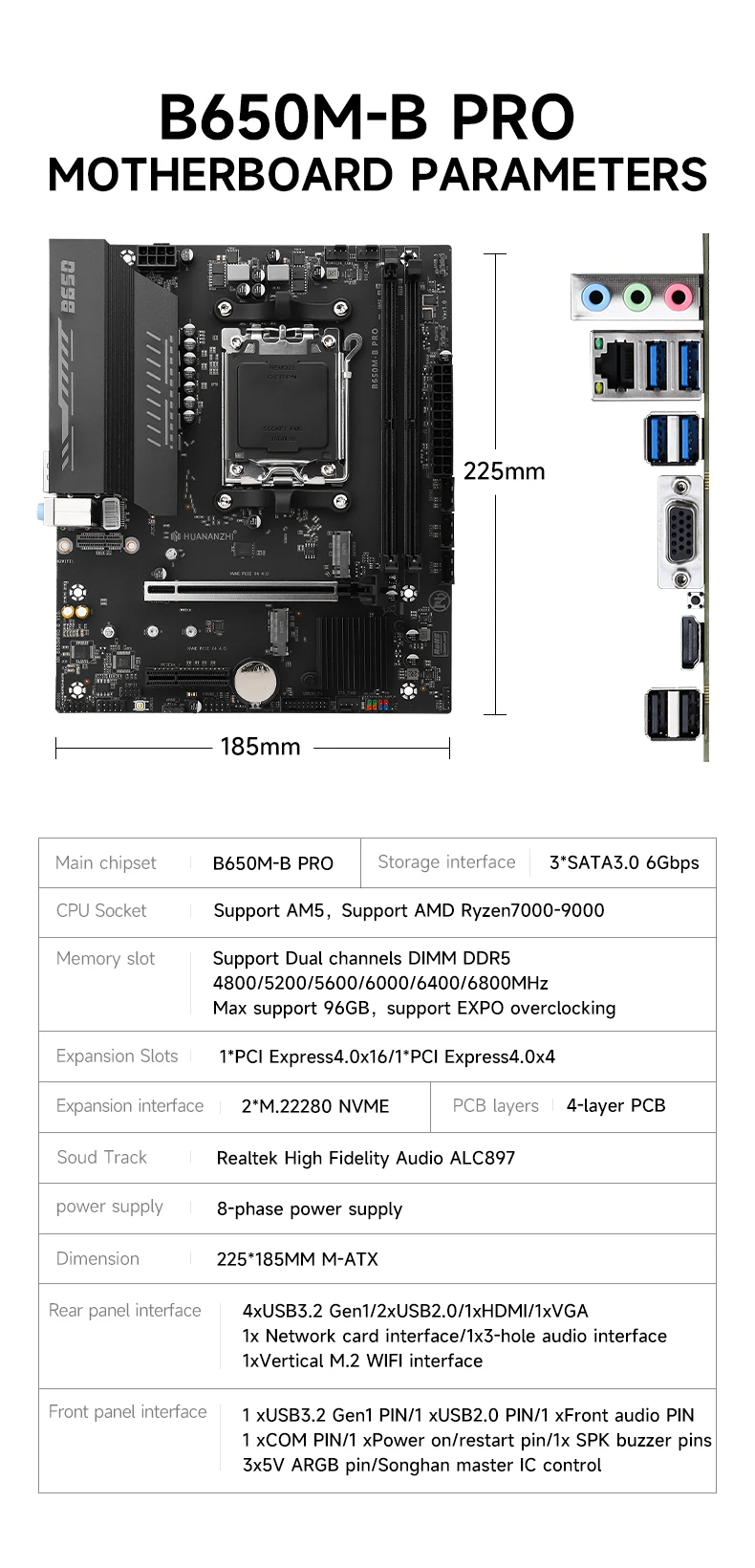 HUANANZHI B650M B PRO AMD AM5 Motherboard Supports Ryzen R5 R7 7000 8000 9000 Series M.2 NVME WIFI Dual Channel DDR5 EXPO RAM
