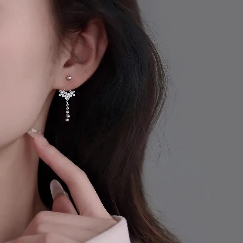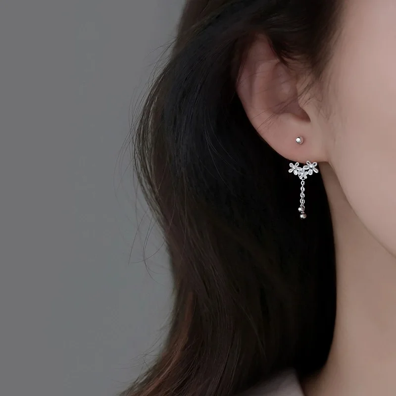 Real 925 Sterling Silver Flower Bead Screw Chain Tassel Plant Stud Earrings For Women Cute Fine Jewelry Light Luxury Accessories