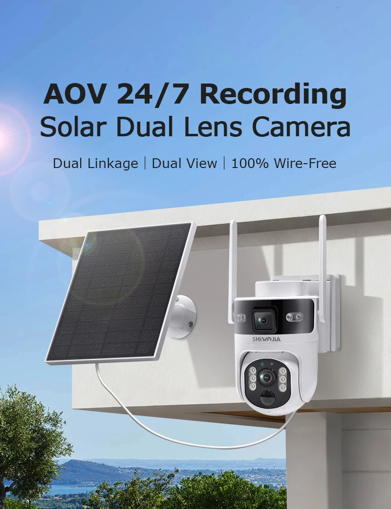 SHIWOJIA 8MP AOV Solar Battery Camera 4G SIM 7/24 Hours Recording Wireless WIFI Security PTZ Camera Dual Lens PIR Night Vision