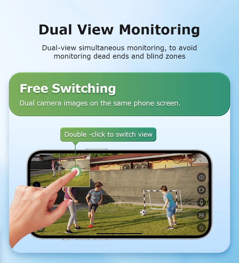 Dual-view simultaneous monitoring, to avoid monitoring dead ends and blind zones