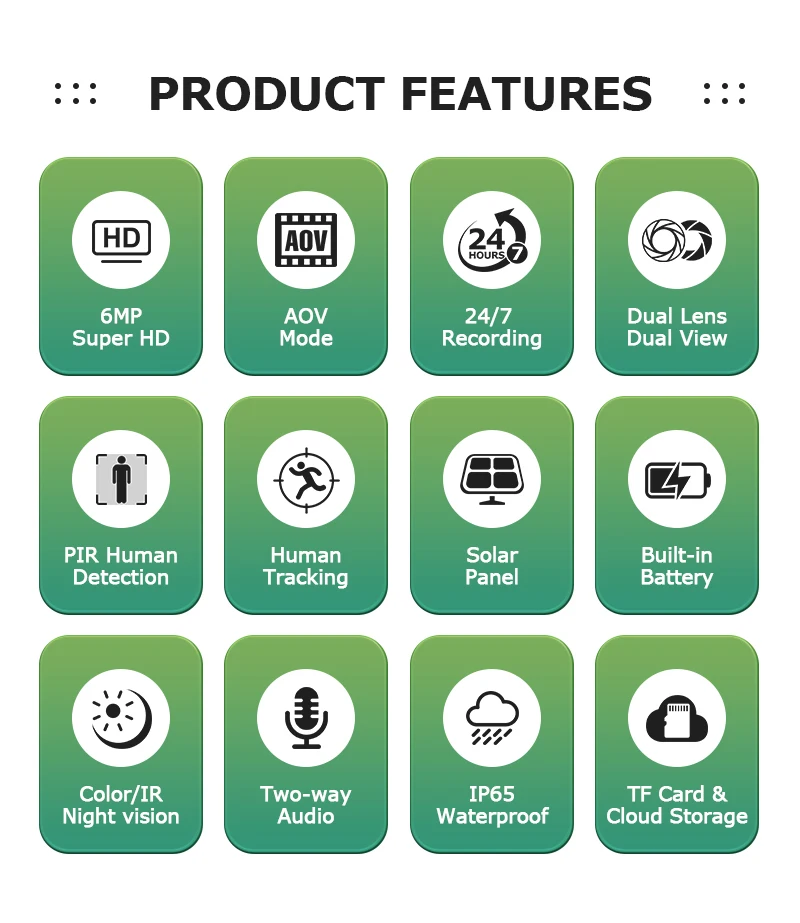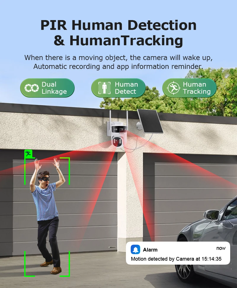 | Auto Tracking | Siren & Spotlight | IP66 | Flexible and Secure Storage up to 128G | Works with Solar Panel
